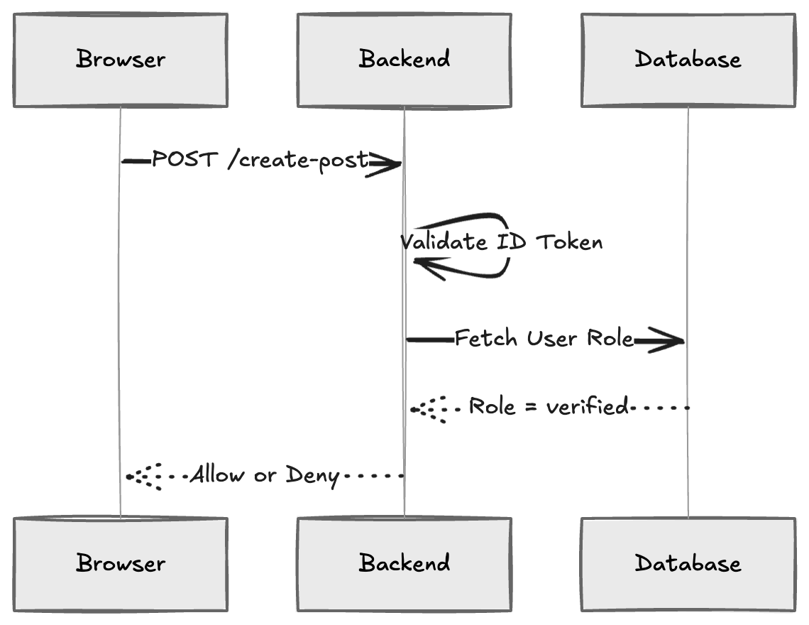 Our backend must check whether this user is allowed to create a post. At this point, the backend already knows the user's identity from the validated ID token. It can extract a unique identifier, user_id = 42