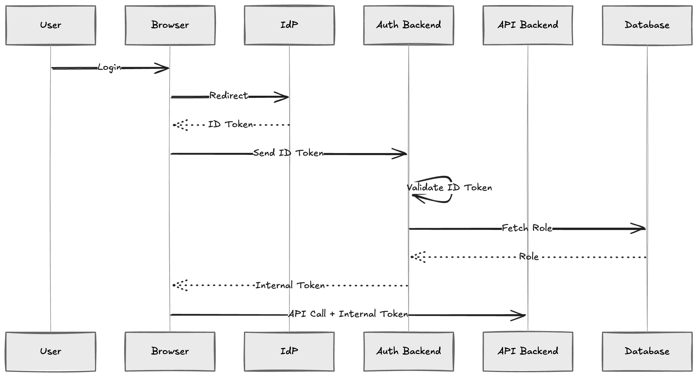 This internal token bridges authentication (handled by the IdP) and business authorization (handled by our backend).